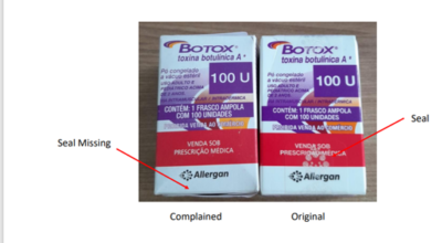 De acordo com a Anvisa, a empresa detentora do registro do medicamento Botox, Allergan Produtos Farmacêuticos Ltda., comunicou à Agência. A Allergan identificação no Brasil duas unidades do produto falsificado: Botox® 100U (toxina botulínica A), lote C7654C3F, validade até 04/2025, que apresenta rotulagem em português.