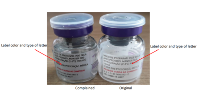 A cor do rótulo e o tipo da letra utilizados na embalagem primária (frasco-ampola) do produto original são diferentes do falsificado.
