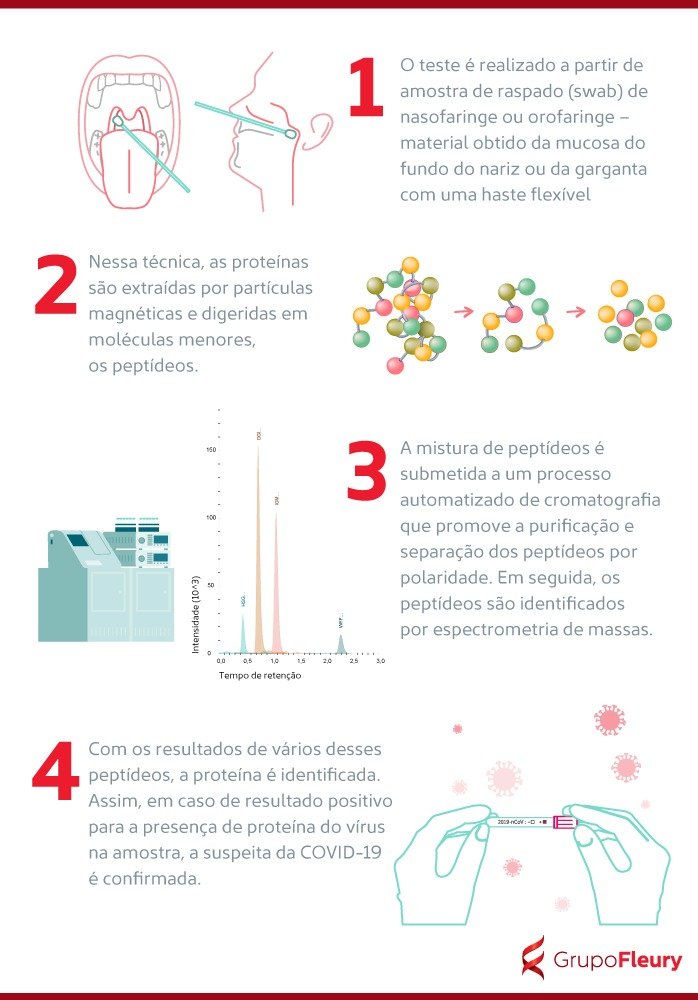 Derivada da tecnologia de espectrometria de massas, ferramenta já utilizada há quase 20 anos no Fleury e que se tornou o padrão ouro para diversas aplicações clínicas, a proteômica direcionada emergiu como uma alternativa aos imunoensaios para análise de proteínas por ser mais específica de desenvolvimento mais rápido, comparado ao tempo necessário para produção de novos anticorpos. Nessa técnica, as proteínas são extraídas por partículas magnéticas e digeridas em moléculas menores, os peptídeos. A mistura de peptídeos é submetida a um processo automatizado de cromatografia, que promove a purificação e separação dos peptídeos por polaridade. Em seguida, os peptídeos são identificados por espectrometria de massas. A técnica consiste na ionização dos analitos, separação por relação massa/carga e detecção das partículas carregadas. Com os resultados de vários desses peptídeos, a proteína é identificada. Assim, em caso de resultado positivo para a presença de proteína do vírus na amostra, a suspeita da COVID-19 é confirmada.