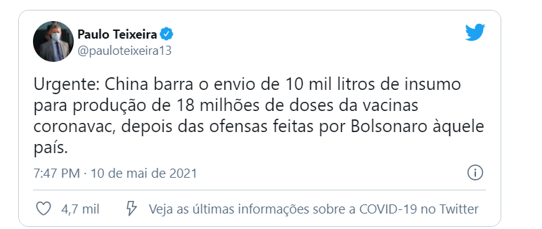 O deputado federal Paulo Teixeira (PT) afirmou que a China barrou o envio de 10 mil litros de ingrediente de farmacêutico ativo (IFA) para a produção de 18 milhões da CoronaVac, vacina produzida pelo Instituto Butantan em parceria com a Sinovac. O motivo seria as declarações do presidente Jair Bolsonaro (sem partido) ao país asiático na última semana.