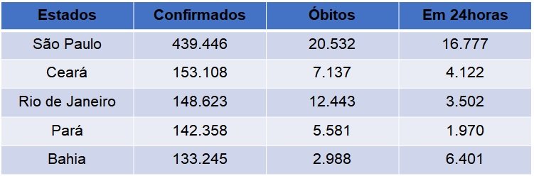 Em todo o mundo já registra 623.863 óbitos pelo novo coronavírus, são 8.661.555 curados da doença. Desde o inicio da pandemia foram confirmados 15.247.848 casos da doença. Com maior proporção no Estado Unidos.