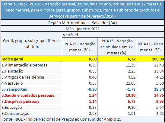 Nos 12 meses encerrados em janeiro, o IPCA-15 acumula alta de 6,32% na RM Salvador, apresentando desaceleração frente ao acumulado nos 12 meses encerrados em dezembro (6,83%).