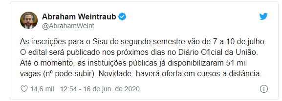 Foi amplamente divulgada pela imprensa que as inscrições para o Sisu seriam iniciadas nesta terça- feira (16/06), porém o edital não foi divulgado. Após os rumores da demissão do ministro da educação, Abraham Weintraub, o MEC (Ministério da Educação) mudou o período de inscrições para o Sisu (Sistema de Seleção Unificada) do segundo semestre, para o mês de julho.